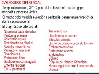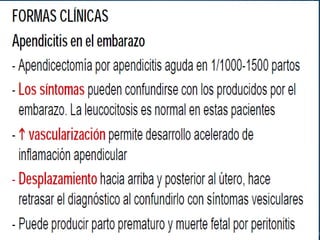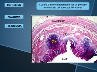 La apendicitis aguda es una inflamación del apéndice vermicular causada comúnmente por un fecalito. Afecta con más frecuencia a personas entre 7-30 años y su mortalidad es de aproximadamente 1.3%. El diagnóstico clínico se basa en el dolor migratorio típico en la fosa iliaca derecha y hallazgos de laboratorio como leucocitosis. La tomografía computarizada y ecografía son exámenes útiles para la confirmación. El tratamiento definitivo es la apendicectomía, preferiblemente lapar