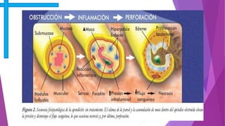 El apéndice es una estructura tubular muscular que se forma en la 8va semana de gestación. La apendicitis aguda es causada por la obstrucción del lumen y usualmente ocurre entre los 15-30 años. Los síntomas principales son dolor en la fosa iliaca derecha, náuseas, vómitos y fiebre. El diagnóstico se realiza mediante examen físico y pruebas de laboratorio e imágenes. El tratamiento es la apendicetomía quirúrgica y antibióticos.