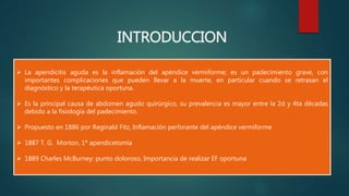 La apendicitis aguda es la inflamación del apéndice vermiforme y constituye la urgencia quirúrgica abdominal más frecuente. Los síntomas incluyen dolor en el cuadrante inferior derecho del abdomen, náuseas y fiebre. El diagnóstico se basa principalmente en la clínica y los hallazgos de laboratorio. El tratamiento es quirúrgico mediante apendicectomía de forma convencional o laparoscópica, seguido de antibióticos y cuidados postoperatorios.