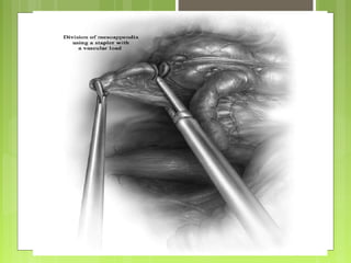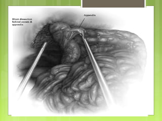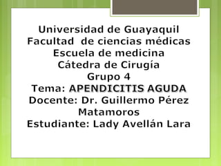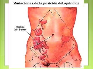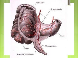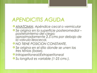 La apendicitis aguda es una inflamación del apéndice cecal, que puede ser causada por obstrucción, con distintos factores etiológicos. Se presenta en fases clínicas que incluyen desde distensión y acumulación de moco, hasta perforación y peritonitis. El tratamiento común es la apendicectomía, ya sea abierta o laparoscópica, con varios riesgos de complicaciones postoperatorias.