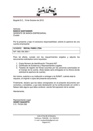 La carta solicita la apertura de una cuenta empresarial para Royal Park LTDA en el Banco Santander, adjuntando los documentos requeridos como el NIT, certificado de existencia y representantes legales, y tarjetas de registro de firmas. El representante legal Henry Bazurto declara que los datos proporcionados son correctos y completos.