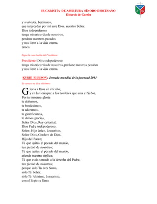 Este documento describe la eucaristía de apertura del sínodo diocesano de la Diócesis de Garzón. Incluye los ritos iniciales como el introito, la monición de entrada, el acto penitencial, la liturgia de la palabra con las lecturas y el evangelio, la profesión de fe, la oración universal, y la liturgia eucarística con la procesión de dones, la oración eucarística, el canto del cordero y la oración después de la comunión. El propósito de esta e