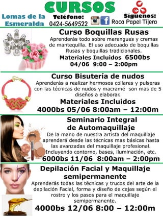 Este documento lista varios cursos de manualidades y decoración que incluyen aprender técnicas de repostería, maquillaje, bisutería, sublimación, bordado, confección y elaboración de accesorios. Cada curso detalla los materiales incluidos, fecha, horario y costo.