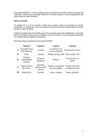 El puntaje APGAR evalúa la condición de un recién nacido en cinco categorías (frecuencia cardíaca, esfuerzo respiratorio, tono muscular, reflejo de irritabilidad y coloración) inmediatamente después del nacimiento y a los cinco minutos, asignando valores de 0, 1 o 2. Un puntaje de 8-10 se considera normal, mientras que menos de 7 puede requerir ayuda médica para estabilizar al bebé.