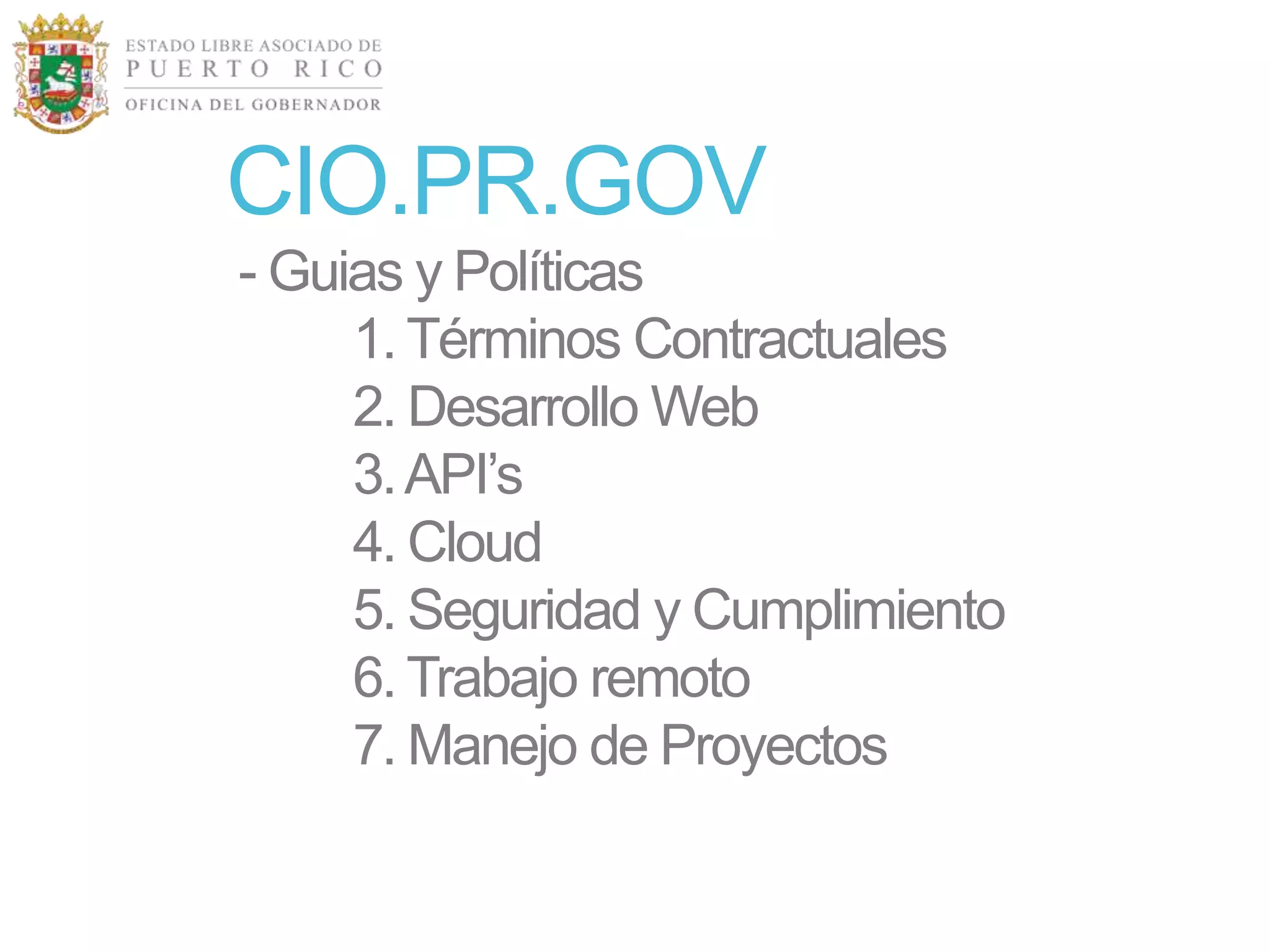 El documento presenta varias guías y políticas del gobierno para el desarrollo de APIs, trabajo remoto, seguridad y manejo de proyectos. También describe los pasos para desarrollar el primer API de una agencia, incluyendo definir la reglamentación, analizar la jurisdicción y asegurar el cumplimiento y seguridad. Por último, discute cómo clasificar y definir el acceso a datos públicos, semi-públicos y privados así como establecer la interacción con terceros.