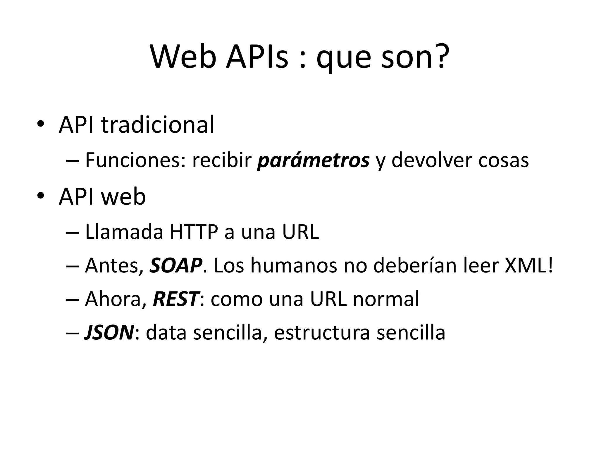 Este documento habla sobre las APIs web y cómo se pueden usar para crear mashups. Explica que las APIs permiten acceder a funcionalidad de otros sitios sin tener que reinventar la rueda mediante llamadas HTTP a URLs. También cubre conceptos como REST, JSON, OpenID y OAuth, que son estándares para autenticación y autorización descentralizadas para acceder a datos privados de manera segura. Finalmente, brinda detalles sobre cómo empezar a desarrollar con la API de Facebook.