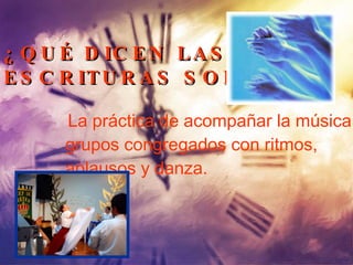 El documento analiza las referencias bíblicas a aplausos y danzas en el contexto de adoración a Dios. Explica que las pocas referencias a danzas en el Antiguo Testamento ocurrieron fuera del Tabernáculo o Templo y no involucraban adoración. No hay evidencia de que los aplausos o danzas fueran parte de los cultos de adoración en el Tabernáculo, Templo, sinagogas o iglesias del Nuevo Testamento debido a la profunda reverencia exigida.