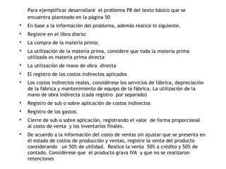 Este documento presenta un ejemplo de registro contable de costos para una empresa productora de papas llamada Batatas Hércules. Incluye la compra de materias primas, costos de producción, costos indirectos reales y aplicados, inventarios finales, sobreaplicación de costos, y venta del producto terminado.