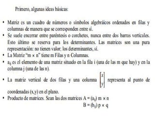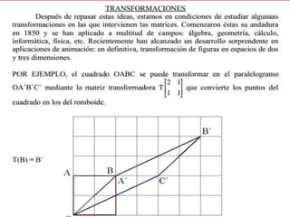 Las matrices se utilizan ampliamente en gráficos 3D, sistemas de ecuaciones y operaciones algebraicas. Las cadenas de Markov y las matrices de transición representan procesos estocásticos y se usan para modelar el comportamiento de los consumidores entre marcas. El wronskiano identifica si funciones son linealmente independientes para ecuaciones diferenciales.