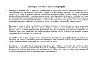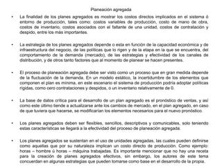 El documento describe diferentes estrategias de planeación agregada para la producción, incluyendo planes de inventario cero, fuerza de trabajo nivelada con y sin órdenes atrasadas. Explica que los planes agregados deben ser flexibles, sencillos y comunicables para lograr efectividad. Además, provee información sobre costos de producción, inventario, contratación y despido para elaborar diferentes planes aplicados a un caso de fabricación.