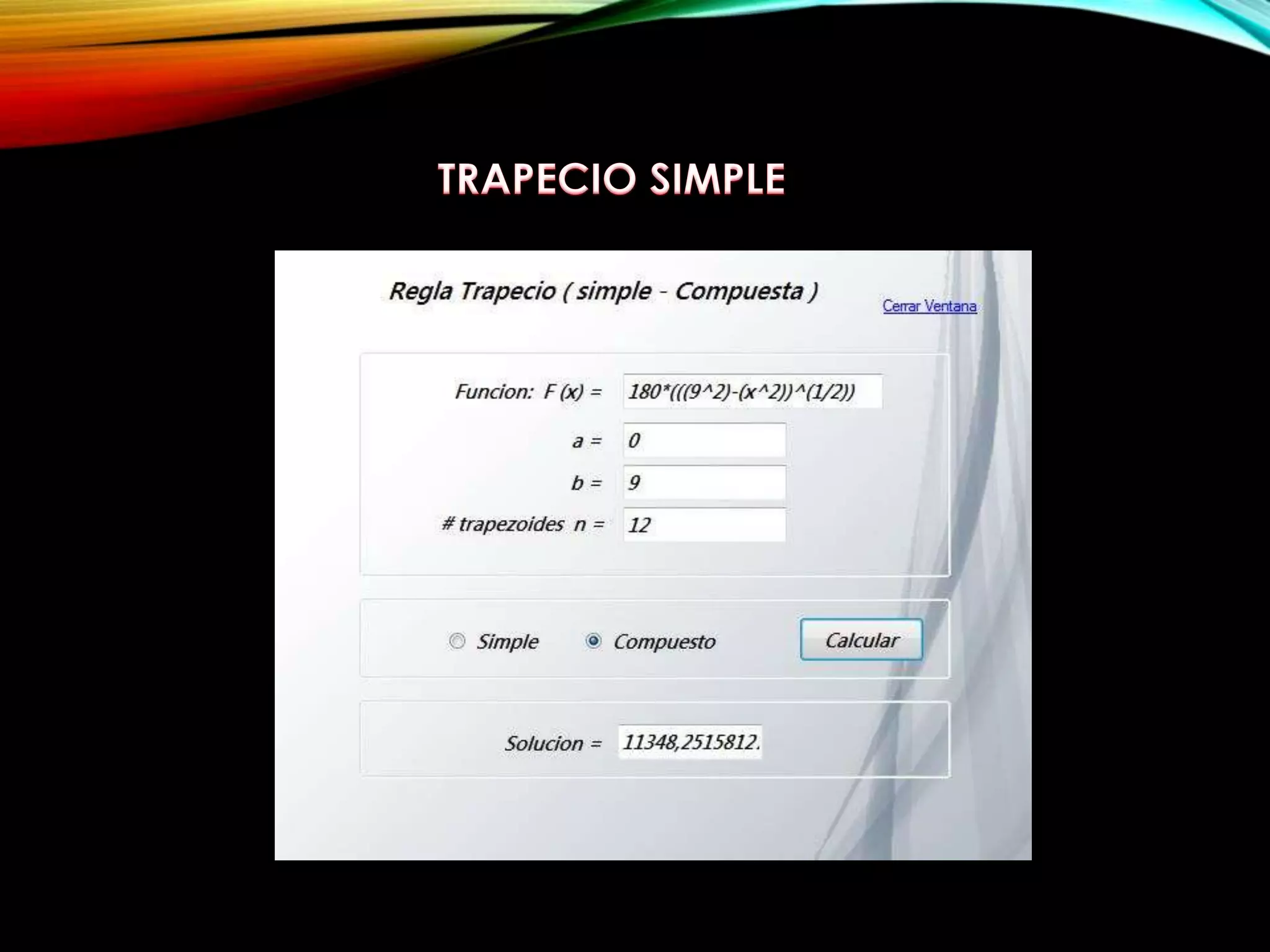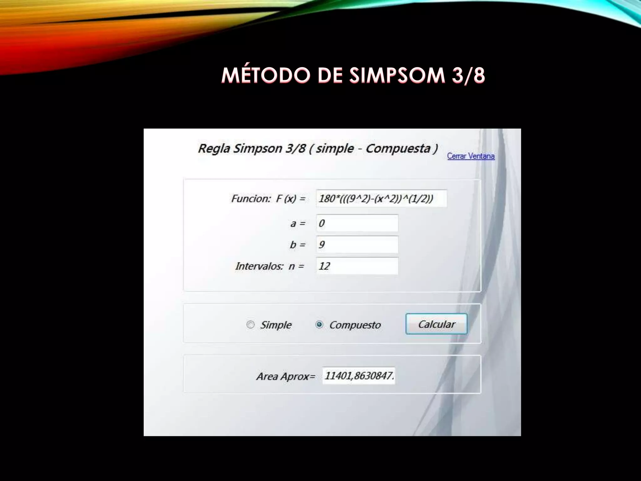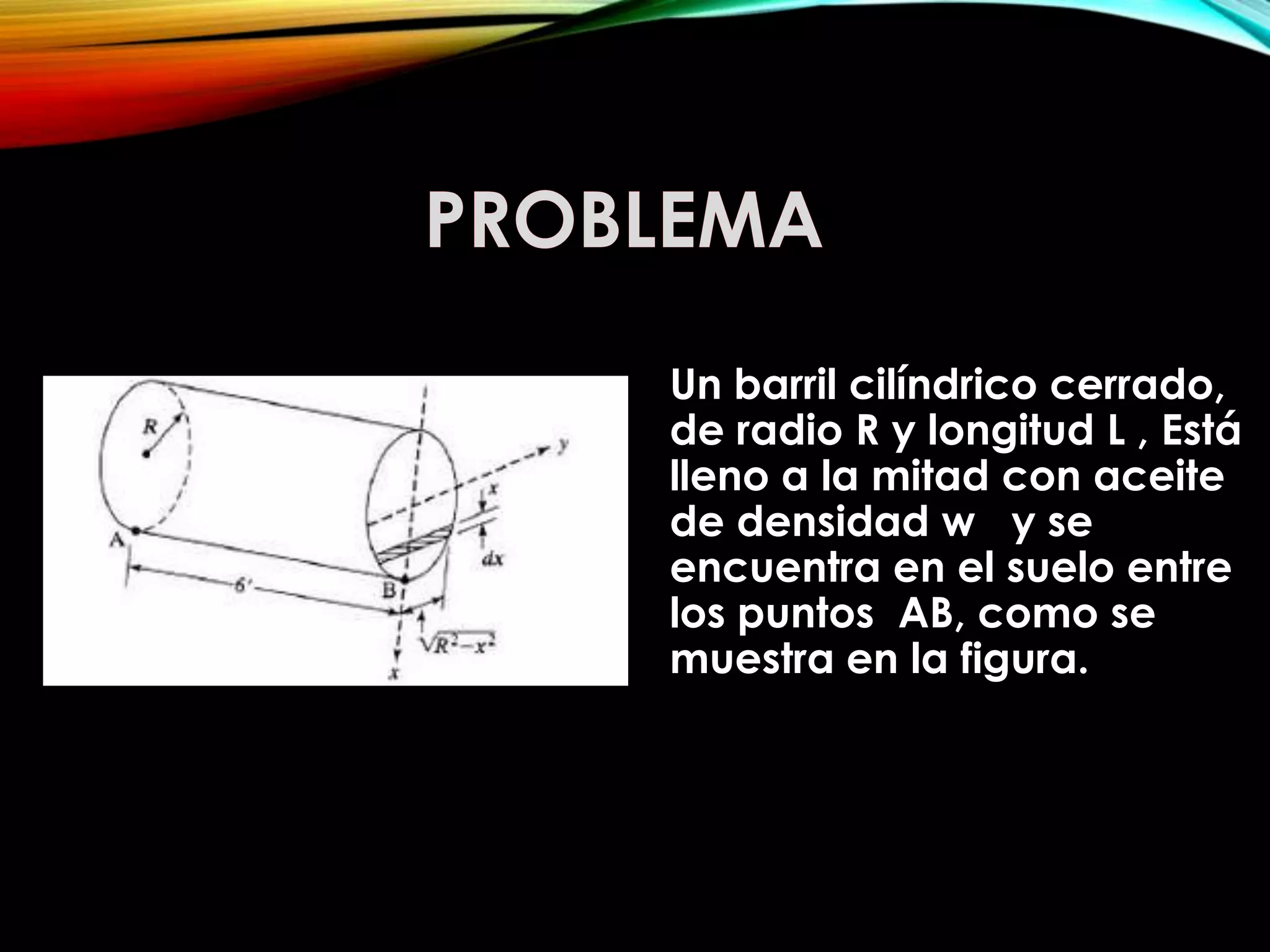 El documento describe cómo calcular la fuerza ejercida sobre el lado circular de un barril cilíndrico medio lleno de aceite. Proporciona la fórmula para calcular la fuerza y describe el uso de los métodos de integración de Trapecio, Simpson 1/3 y Simpson 3/8 para resolver el problema. El método de Simpson 1/3 se identifica como el que presenta menor error de truncamiento y es recomendado para este cálculo. La fuerza calculada es de 11410,6927362grf.