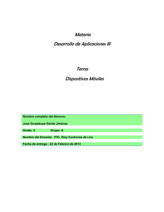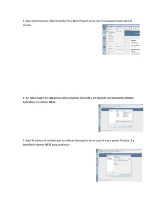 El documento proporciona instrucciones para crear una aplicación móvil en Java ME. Explica los pasos para crear un nuevo proyecto móvil en NetBeans, seleccionar el dispositivo, agregar un formulario, campos de texto e ítems de comando. También describe cómo diseñar la interfaz gráfica del usuario y agregar código para calcular y mostrar el resultado basado en la entrada del usuario.