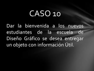 El documento describe una solución para dar la bienvenida a los nuevos estudiantes de la escuela de Diseño Gráfico. La solución consiste en un polígono de 10 lados realizado en metal, donde cada lado tendrá información sobre los niveles y cátedras del programa. El objeto se ubicará en la entrada de la escuela para orientar a los nuevos estudiantes.