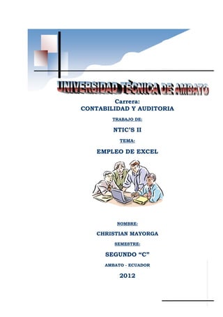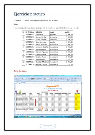 Este documento presenta un ejercicio práctico utilizando Excel para calcular los pagos de los empleados de una empresa. Se proporcionan los datos de 13 empleados incluyendo número, cédula, nombre, cargo y sueldo. Se muestran funciones de Excel como auto llenado, referencias celulares, encadenamiento y porcentajes para calcular la ganancia de cada empleado. El documento concluye que conocer y aplicar estas funciones de Excel ayuda a optimizar tiempo y ser más competitivo.