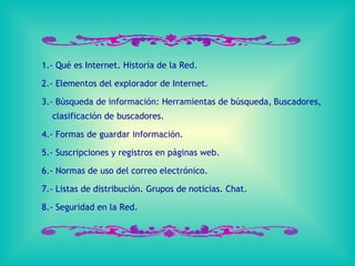 Este documento presenta un curso sobre aplicaciones prácticas de Internet que incluye temas como el manejo del explorador, búsqueda de información, guardar información, uso de correo electrónico y otras aplicaciones. El curso también cubre breve historia de Internet, elementos del explorador, herramientas de búsqueda como directorios temáticos y motores de búsqueda, formas de guardar información, suscripciones y registros en páginas web, normas de uso de correo electrónico y elementos básicos de este.