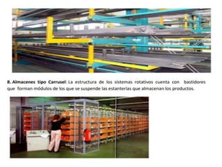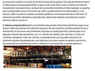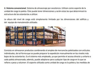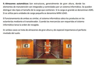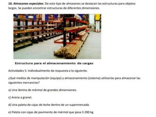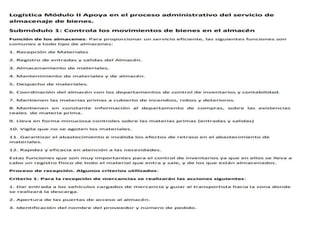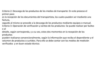 El documento detalla el proceso de recepción y almacenamiento de mercancías en un almacén, incluyendo criterios y procedimientos para verificar la cantidad y calidad de los productos recibidos. Se destacan las actividades como la revisión de documentos, control de calidad, y la organización de productos según su vencimiento. También se menciona la importancia de la planificación y el uso adecuado del espacio para optimizar la eficiencia de la recepción y almacenamiento.