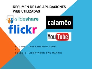 Este documento resume cuatro aplicaciones web comúnmente utilizadas: Calameo, que permite crear y compartir publicaciones interactivas; YouTube, un sitio para subir y ver videos; SlideShare, para compartir presentaciones; y Flickr, para almacenar y compartir fotos. Cada aplicación ofrece una forma única de publicar y compartir contenido digital con otros.