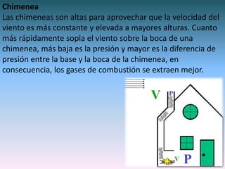 Las chimeneas son altas para aprovechar los vientos más constantes y rápidos a mayores alturas, lo que reduce la presión en la boca de la chimenea y permite que los gases de combustión se extraigan mejor. La reducción del área de una tubería o el estrangulamiento en un carburador causan que la velocidad del fluido aumente y la presión disminuya, permitiendo el flujo de gases o líquidos a través de ellos.
