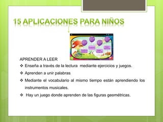 Estas aplicaciones ofrecen varias herramientas educativas para niños como juegos de rompecabezas, colorear, aprender letras, números, idiomas e instrumentos musicales. Algunas enseñan sobre el cuidado de mascotas o la coordinación, y la mayoría busca entretener al tiempo que se aprende.