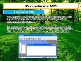 Los formularios MDI son formularios que contienen otros formularios dentro. Un proyecto solo puede tener un formulario MDI principal, mientras que puede tener múltiples formularios MDI secundarios. El formulario MDI principal se denomina "padre" y los formularios dentro se denominan "hijos".
