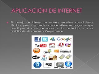 Este documento resume las principales aplicaciones de Internet como el correo electrónico, la World Wide Web, grupos de noticias, foros, chat y videoconferencias. También discute el valor educativo de Internet pero enfatiza la necesidad de determinar su alcance apropiado y crear conciencia sobre la validez de su contenido. Finalmente, concluye que existen diversos programas e Internet que facilitan el acceso y descarga de archivos para los usuarios.