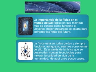 El documento describe cómo la ciencia, y en particular la física, contribuye a mejorar la calidad de vida de las personas a través de aplicaciones tecnológicas. La física se aplica en áreas como la electricidad, el transporte, la medicina, las telecomunicaciones y más. También explica cómo la ciencia ayuda a resolver problemas personales como defectos de visión mediante el uso de lentes, y problemas sociales como los accidentes de tráfico a través del diseño de carreteras y señales de tránsito basadas en leyes físic