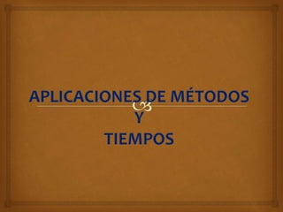 Este documento define los métodos y tiempos como un sistema de control utilizado para analizar los métodos de trabajo y establecer tiempos estándar. Explica que aumentar la productividad mediante métodos y tiempos mejorados permite que las empresas crezcan y sean más rentables. Finalmente, detalla los objetivos, características y simbología del estudio de métodos y tiempos para incrementar la productividad y reducir costos.