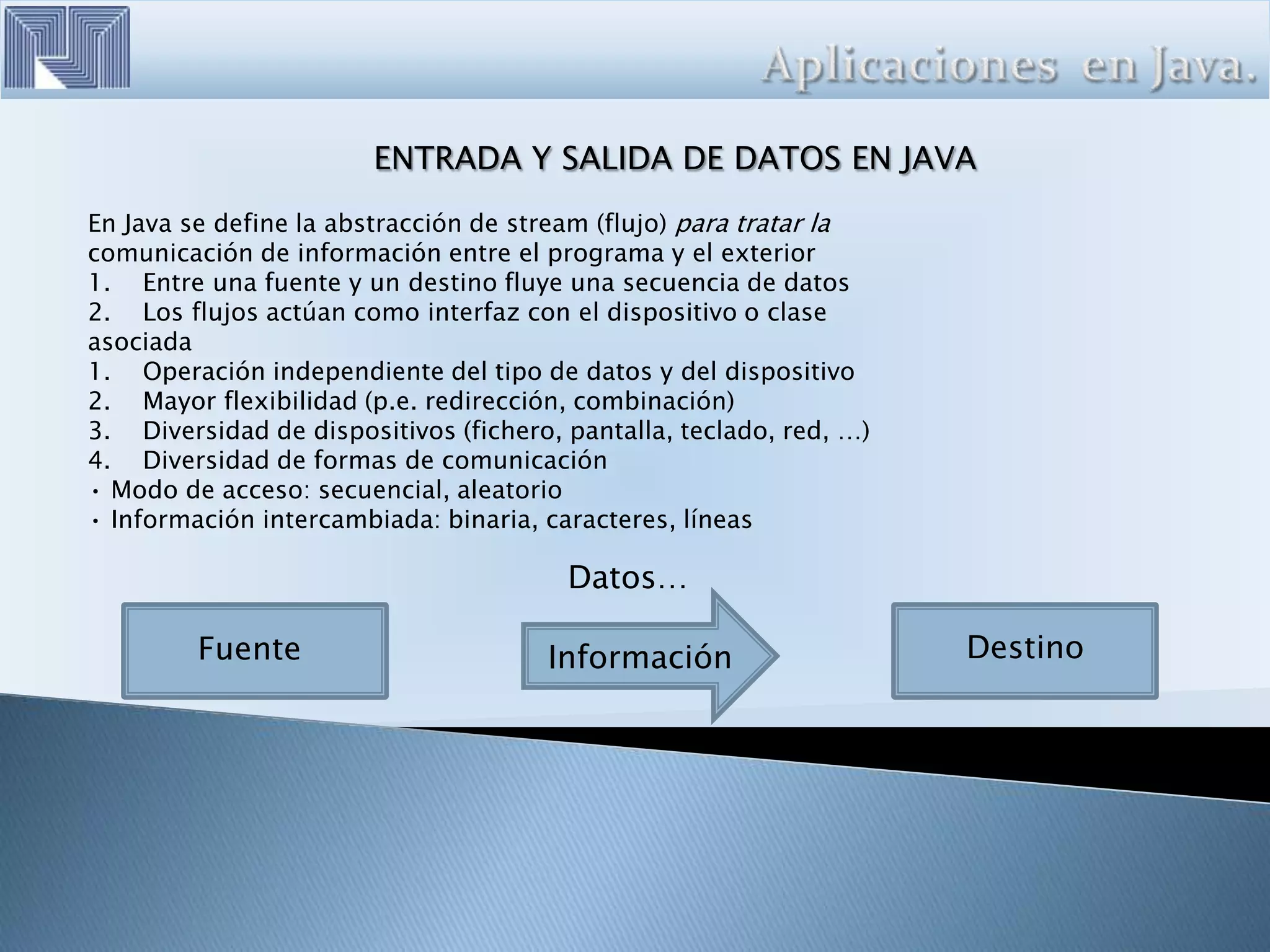 Este documento describe varias clases y frameworks de Java para la entrada y salida de datos, incluyendo la clase System para la entrada y salida estándar, las Java Foundation Classes (JFC) para interfaces gráficas, el Java Media Framework (JMF) para datos multimedia, Java 3D para gráficos 3D, JavaBeans para componentes reutilizables, la Java Native Interface (JNI) para interactuar con otros lenguajes, y RMI y Java IDL para desarrollo de aplicaciones distribuidas.