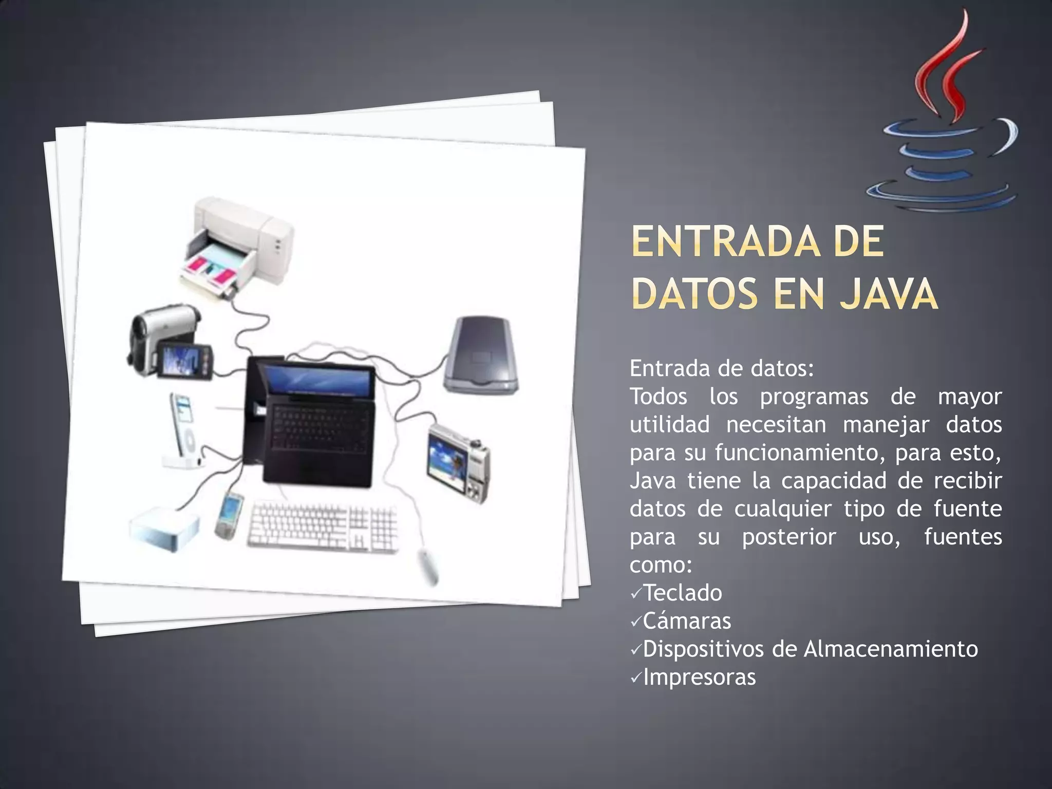 Java puede recibir datos de varias fuentes como el teclado, cámaras y dispositivos de almacenamiento, y mostrar los resultados del procesamiento de datos. Se utilizan clases como InputStream, FileReader y Scanner para la lectura de datos, y OutputStream y JOptionPane para la escritura. Java también permite la creación y manipulación de archivos.