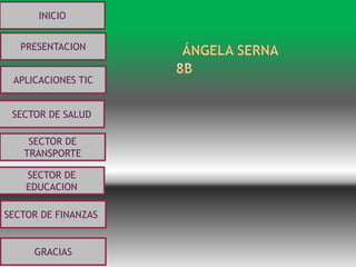 El documento describe brevemente la aplicación de las tecnologías de la información y la comunicación (TIC) en diferentes sectores como la educación, el transporte, la salud y las finanzas. Señala que las TIC son importantes para mejorar la educación y mantener sistemas de información actualizados de pacientes en el sector salud. También menciona que las TIC han tenido una relación privilegiada con el sector financiero y han mejorado procesos internos en banca.