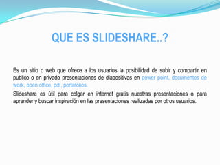 Slideshare es un sitio web que permite a los usuarios subir y compartir presentaciones de diapositivas de manera gratuita y pública o privada, y también aprender de las presentaciones de otros, mientras que Vimeo es una red social basada en video donde los usuarios pueden compartir, almacenar y comentar videos, y Google+ es una red social operada por Google que usa HTML5 y requiere que los usuarios tengan más de 13 años.