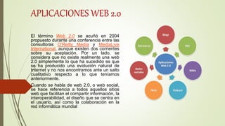 La Web 2.0 se refiere a sitios web que facilitan el compartir información y la colaboración entre usuarios. Se caracteriza por permitir que los usuarios sean contribuyentes activos en lugar de solo espectadores pasivos. Las aplicaciones Web 2.0 se clasifican en herramientas colaborativas, redes sociales, mapas conceptuales, presentaciones, blogs y wikis, las cuales permiten que los estudiantes trabajen juntos y compartan contenidos de manera simultánea.