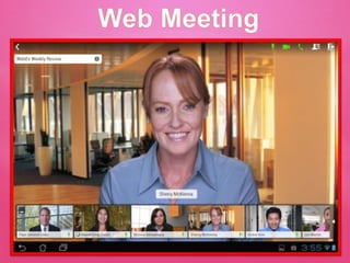 Este documento presenta información sobre herramientas de presentaciones en línea, videoconferencias y páginas web. Describe tres herramientas para cada categoría, incluyendo Google Drive, Zoho Show y Genial.ly para presentaciones en línea; Webex, Tango y Skype para videoconferencias; y WordPress, Wix y Google Sites para crear páginas web. Explica las características, fortalezas, debilidades y recomendaciones de cada herramienta.