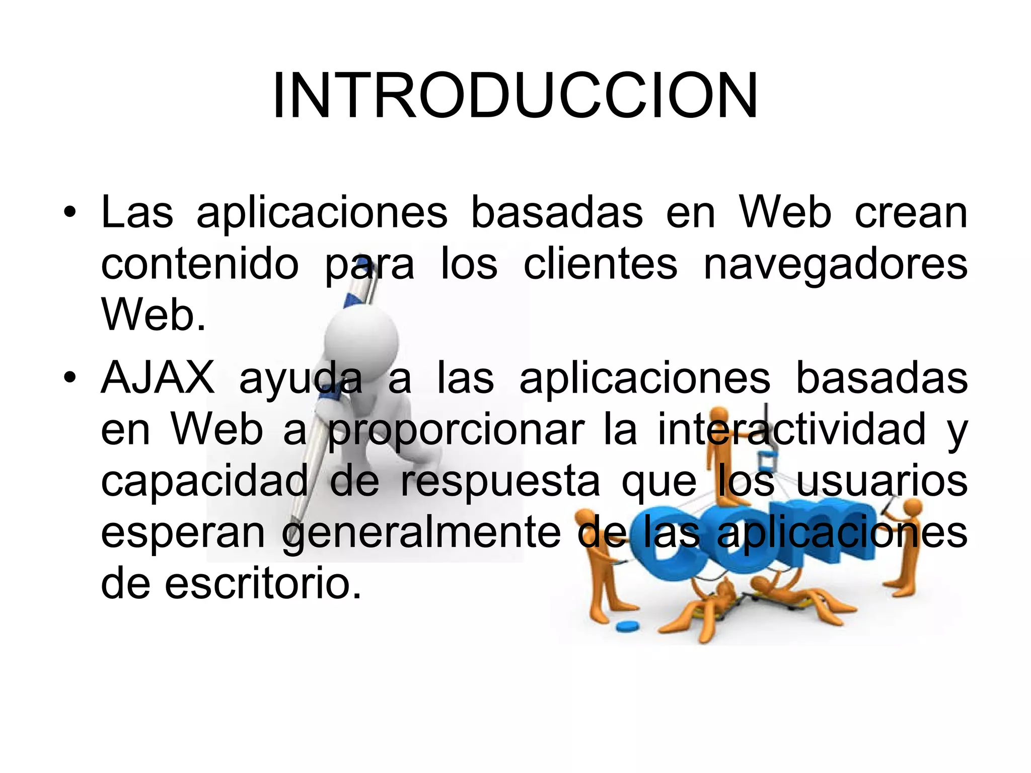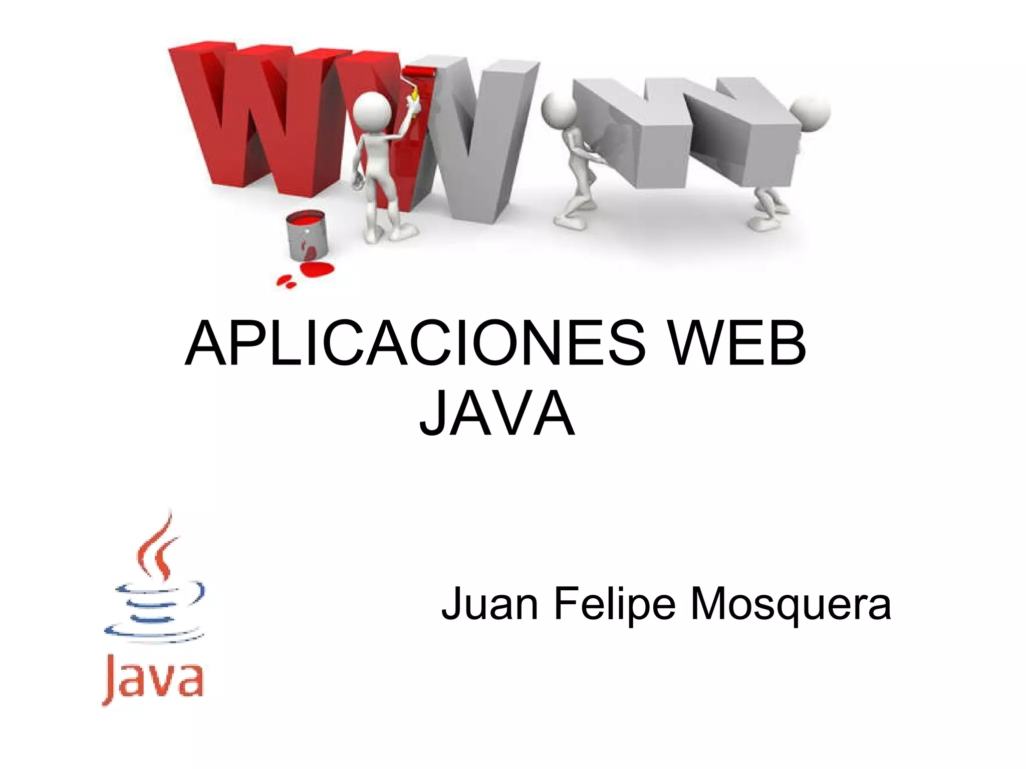 Este documento describe las principales tecnologías para el desarrollo de aplicaciones web en Java, incluyendo servlets, JSP, JSF y JavaBeans. Explica que los servlets y JSP permiten generar contenido dinámico en el servidor y manejar peticiones HTTP, mientras que JSF simplifica el diseño de la interfaz de usuario separándola de la lógica del negocio. También describe el procesamiento de eventos en JSF y la interacción entre el cliente web y la aplicación web a través de objetos HTTPServletRequest y HTTPServletResponse