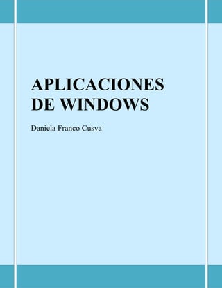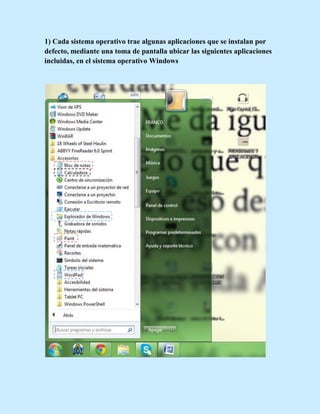 Este documento describe las aplicaciones preinstaladas que vienen con Windows y cómo acceder al Panel de control para configurar opciones. Incluye aplicaciones como Bloc de notas, Outlook Express, Paint, Windows Media Player, Wordpad, Internet Explorer, Explorador de Windows y Calculadora. También explica que el Panel de control se puede acceder haciendo clic en el botón Inicio y luego en Configuración y Panel de control, y que allí se pueden configurar opciones como hardware, programas, ratón, pantalla, teclado, sistema, internet y energía.