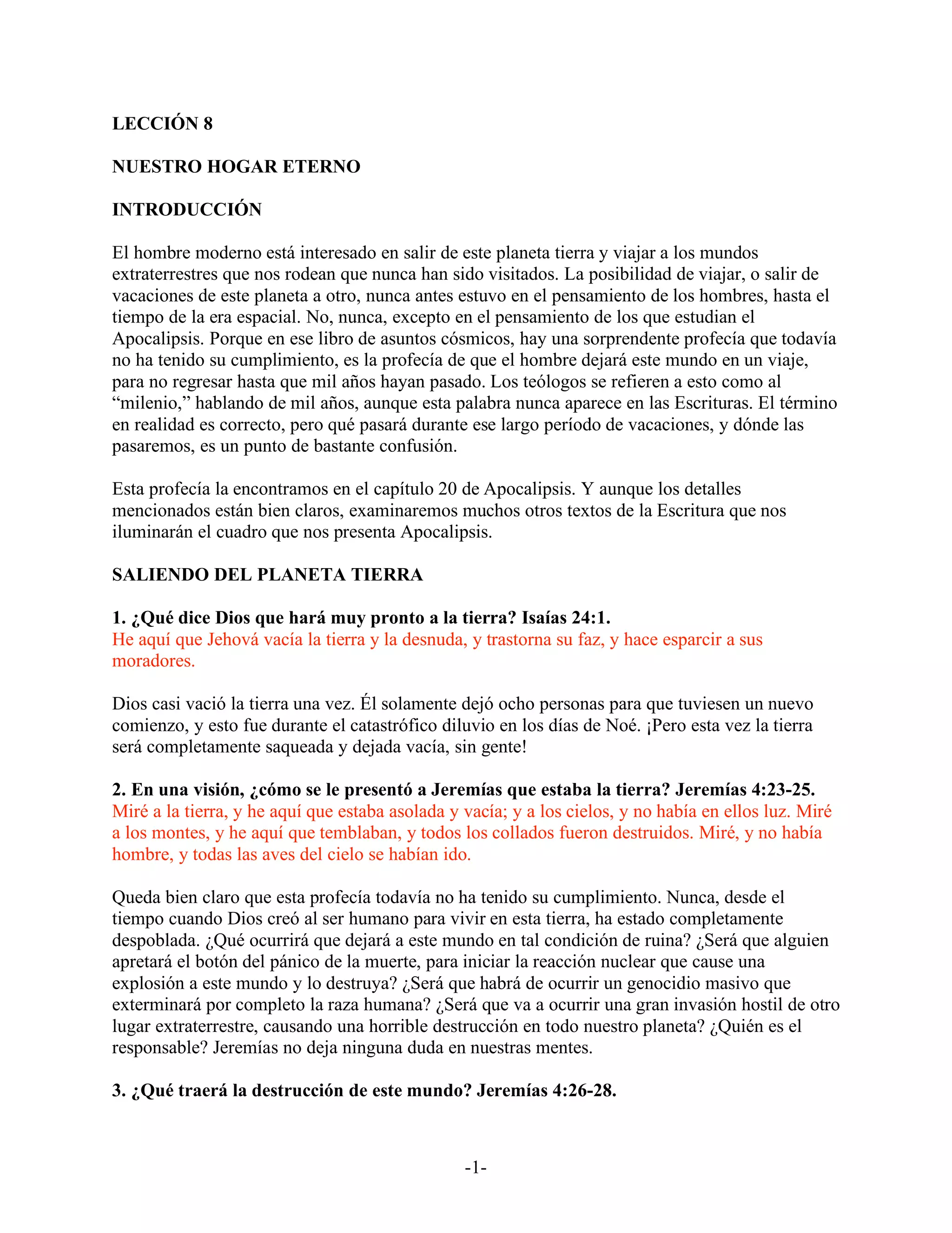 Este documento resume la profecía bíblica sobre lo que sucederá al final de los tiempos. Indica que cuando Jesús regrese, sacará a los santos de la tierra para llevarlos a vivir con él en el cielo por mil años. Durante ese tiempo, los santos juzgarán a los ángeles caídos y a los muertos impíos. Luego Satanás será liberado brevemente antes de ser destruido junto con los impíos rebeldes. Al final, Jesús regresará a la tierra con los santos y est
