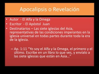 Este documento presenta una introducción al libro bíblico de Apocalipsis. Explica que Juan el Apóstol escribió el libro para consolar y amonestar a las siete iglesias de Asia. Describe las diferentes perspectivas de interpretación del libro y se enfoca en la perspectiva futurista. Resume brevemente los mensajes a las siete iglesias y conceptos clave como el arrebatamiento, la segunda venida de Cristo y el milenio.