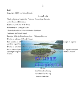 El documento presenta una introducción al libro de Apocalipsis de Simon J. Kistemaker. Brevemente describe la estructura del libro, incluyendo los capítulos y temas principales. También discute el uso frecuente del número siete y su significado simbólico de totalidad. Finalmente, enfatiza que a pesar de su lenguaje figurativo, Apocalipsis es la palabra de Dios dirigida a la iglesia.