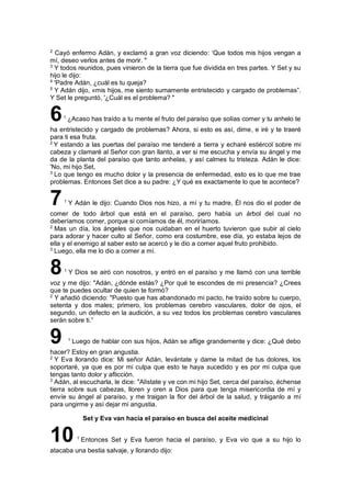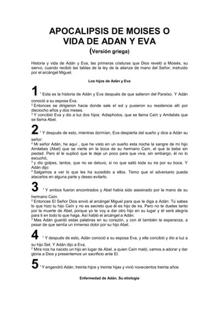 El documento narra la historia de Adán y Eva, sus hijos y la transgresión que condujo a la muerte y enfermedades. Adán comparte su dolor por la muerte de Abel a manos de Caín, y se relata la búsqueda de un ungüento medicinal en el paraíso que podría aliviar su sufrimiento. La historia culmina con el juicio de Dios a Adán y Eva por su desobediencia, estableciendo las consecuencias del pecado en la humanidad.