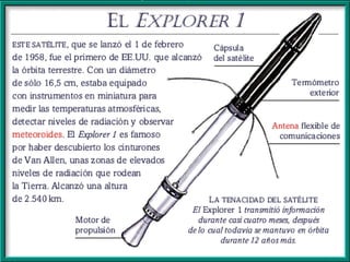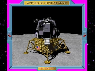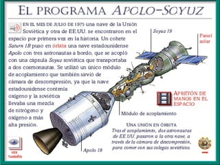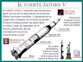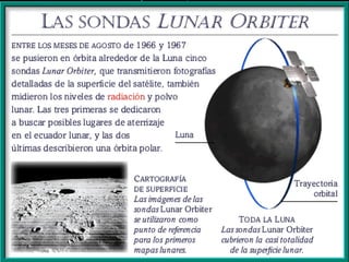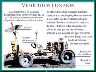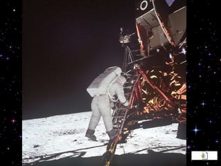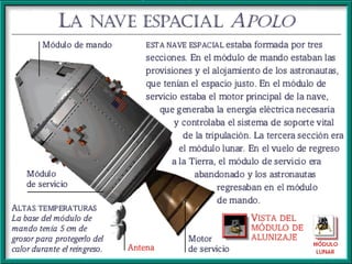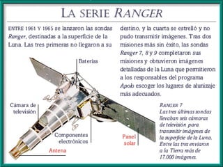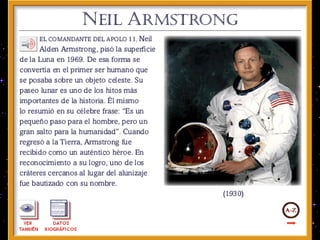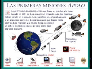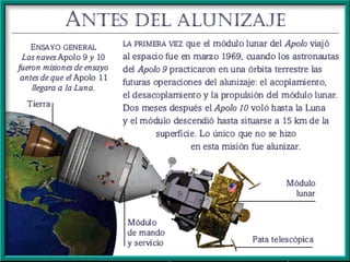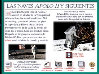 El documento resume las principales misiones del programa Apolo de la NASA para llevar al hombre a la Luna entre 1966 y 1972. Destaca el primer alunizaje exitoso de Apolo 11 en 1969, cuando Neil Armstrong pronunció las famosas palabras "este es un pequeño paso para el hombre, un gran salto para la humanidad". Luego de varias misiones de prueba no tripuladas y tripuladas, Apolo 11 logró con éxito el alunizaje y los astronautas pasaron un tiempo en la superficie lunar antes de regresar a salvo a la Tierra.