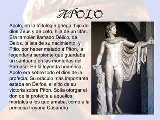 Apolo era el dios griego de la profecía, la música, el arco y la flecha. Según la leyenda, Apolo persiguió a la ninfa Dafne, quien fue transformada en un laurel para escapar de él. Apolo era conocido por su habilidad con la lira y el arco, y protegía especialmente a los muchachos, mientras que su hermana gemela Ártemis protegía a las muchachas.