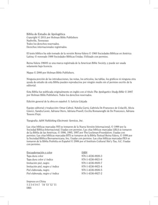 Este documento presenta la introducción y los editores de la "Biblia de Estudio de Apologética". La introducción explica que la Biblia incluye notas y artículos escritos por eruditos cristianos para proporcionar defensas fundamentadas de la fe cristiana y responder a las críticas. Los editores son S. Leticia Calçada, Ted Cabal y varios editores asociados. La Biblia también incluye perfiles de apologistas históricos y más de 125 artículos sobre temas apologéticos.