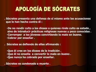 Sócrates se defiende de las acusaciones de no rendir culto a los dioses del estado, corromper a los jóvenes y cobrar por enseñar. Afirma que cree en los dioses tradicionales y que nunca ha cobrado por enseñar. Sin embargo, es condenado a muerte porque ha molestado a los atenienses al demostrar que los considerados sabios no lo son realmente y critica que se preocupen más por la riqueza que por la virtud.