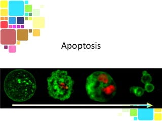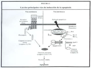 Este documento presenta información sobre el tema de apoptosis. Explica que la apoptosis es una vía de muerte celular programada que involucra la activación de enzimas que degradan el ADN y proteínas celulares. Luego describe algunas causas de apoptosis como daño en el ADN, acumulación de proteínas mal plegadas, y lesiones celulares durante infecciones. Finalmente, resume los mecanismos principales de apoptosis, incluyendo la vía mitocondrial intrínseca y la vía de los receptores de muerte extrínseca.
