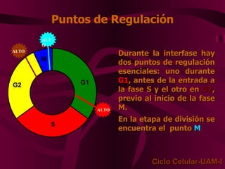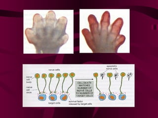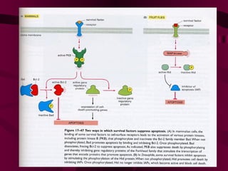 El documento describe los mecanismos moleculares de la apoptosis o muerte celular programada. Existen dos vías principales de apoptosis: la vía extrínseca mediada por receptores de muerte y la vía intrínseca mediada por la mitocondria. Esta última involucra a la familia de proteínas Bcl-2, las cuales controlan la liberación del citocromo c de la mitocondria y la activación subsecuente de la cascada de caspasas, llevando a la apoptosis.