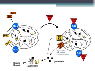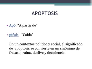 El documento resume los conceptos clave de la apoptosis o muerte celular programada. Explica que la apoptosis es un proceso genéticamente regulado de autodestrucción celular en respuesta a señales ambientales o de estrés. Describe las características morfológicas de la apoptosis y diferencia entre apoptosis y necrosis. Además, explica las vías y moléculas reguladoras clave de la apoptosis como la familia Bcl-2, caspasas y la formación del apoptosoma.