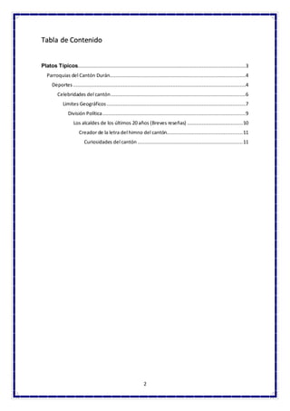 El documento proporciona información sobre el cantón Durán en Ecuador, incluyendo sus platos típicos, parroquias, deportes celebridades, límites geográficos, división política, alcaldes recientes, creador del himno del cantón y curiosidades.