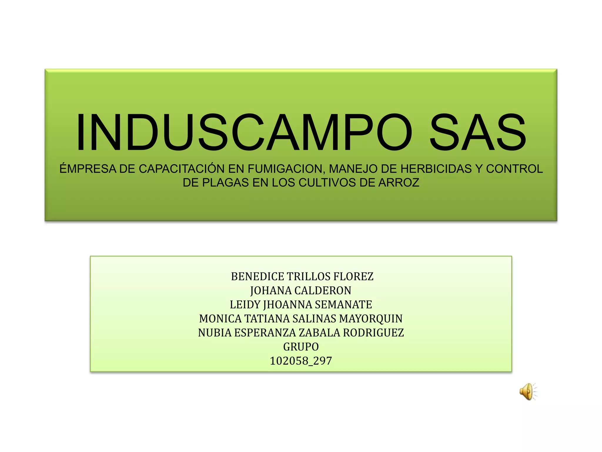 Este documento propone establecer una empresa de capacitación en fumigación, manejo de herbicidas y control de plagas en cultivos de arroz en el municipio de Flandes Tolima. Actualmente las plagas ocasionan pérdidas del 40% de la producción de arroz a pesar del uso excesivo de plaguicidas. La empresa brindaría capacitación a los agricultores para mejorar el control de plagas de manera ecológica y sostenible.