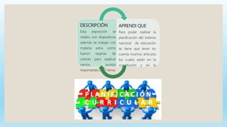 Este documento resume 10 presentaciones sobre diferentes tipos de planificación curricular. Cada presentación incluye una breve descripción de cómo se realizó y un resumen de lo que se aprendió. Las presentaciones cubrieron temas como la planificación del sistema nacional de educación, la planificación curricular institucional, la planificación curricular anual y la planificación de aula.