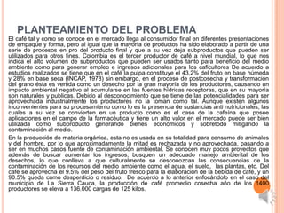 Este documento propone aprovechar la pulpa de café, un subproducto de la producción de café que actualmente se desecha y contamina las fuentes hídricas, para mitigar la contaminación y generar ingresos adicionales para los caficultores. Plantea la posibilidad de usar la pulpa como base para otros productos o en procesos como la elaboración de abonos orgánicos. El objetivo general es presentar opciones para el aprovechamiento de la pulpa que beneficien el medio ambiente y los productores de café en el municipio de La Sierra,